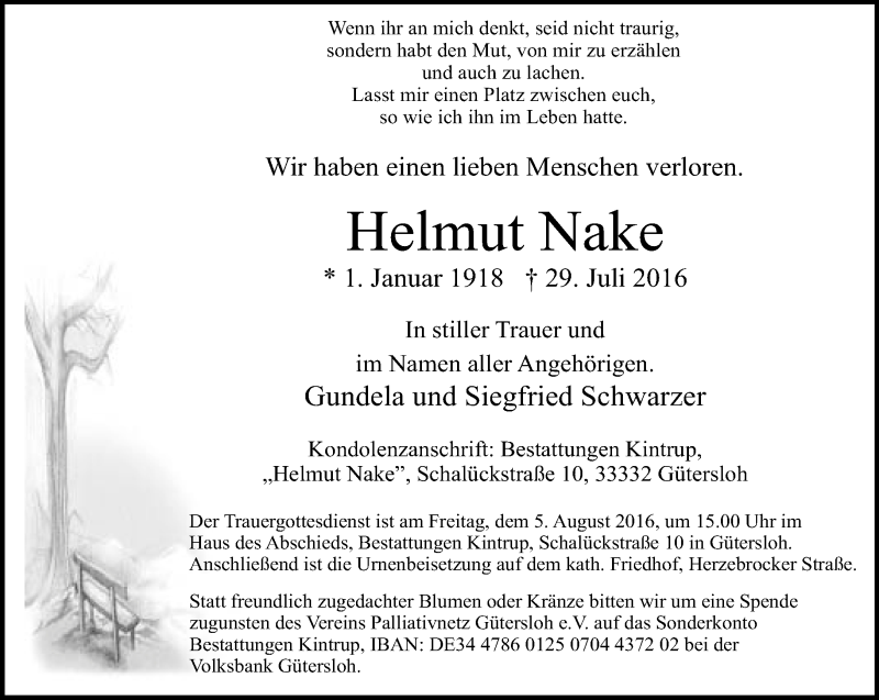 Hier finden Sie alle Traueranzeigen aus der Zeitung, die bisher für Helmut Nake erschienen sind. Weitere Traueranzeigen, die in der Zeitung erscheinen, werden hier ebenfalls aufgelistet