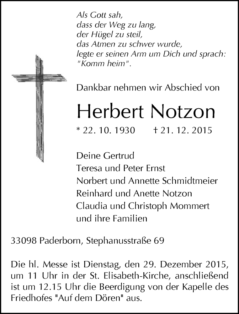 Hier finden Sie alle Traueranzeigen aus der Zeitung, die bisher für Herbert Notzon erschienen sind. Weitere Traueranzeigen, die in der Zeitung erscheinen, werden hier ebenfalls aufgelistet