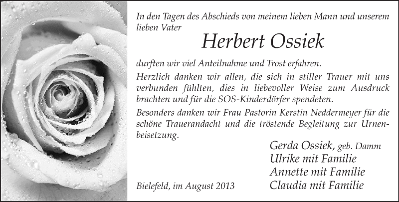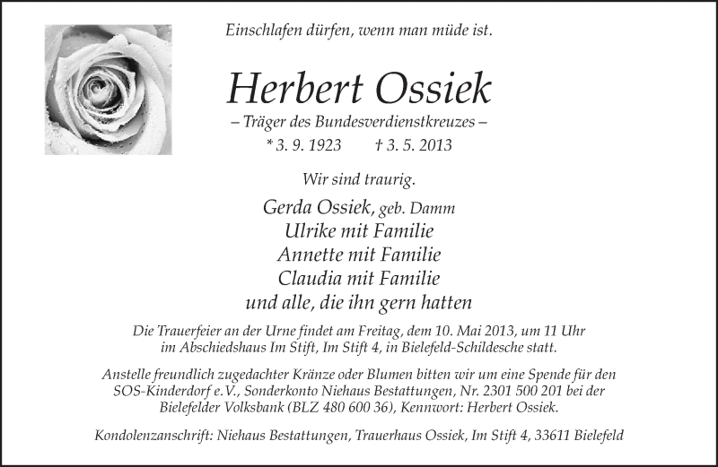 Hier finden Sie alle Traueranzeigen aus der Zeitung, die bisher für Herbert Ossiek erschienen sind. Weitere Traueranzeigen, die in der Zeitung erscheinen, werden hier ebenfalls aufgelistet