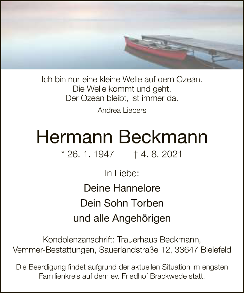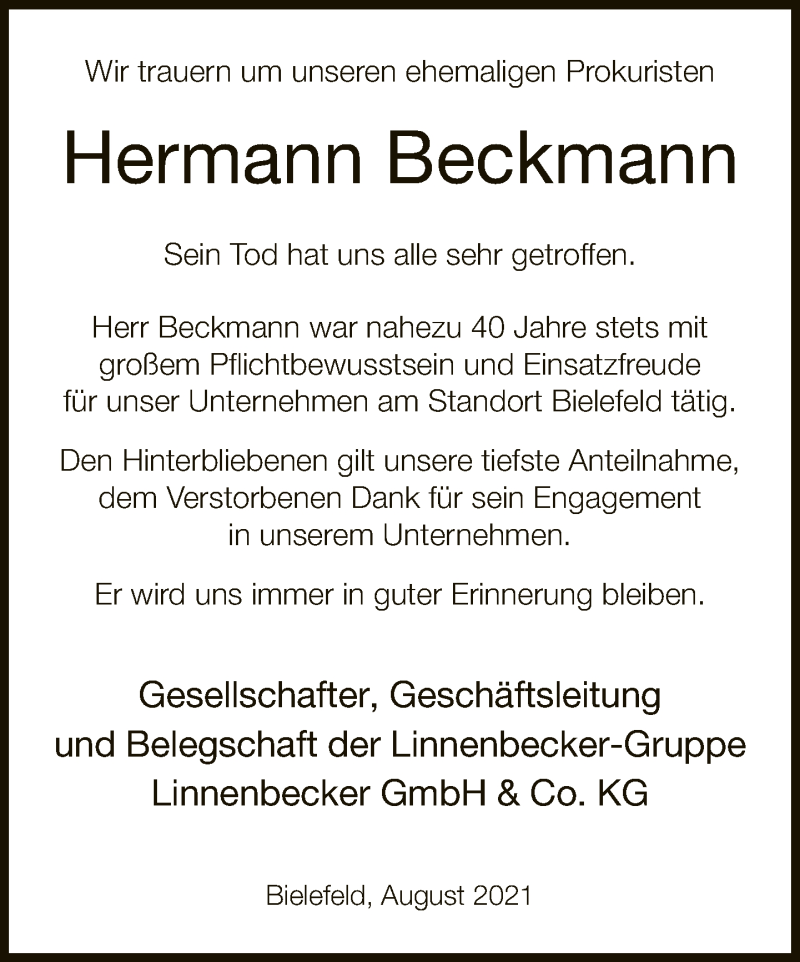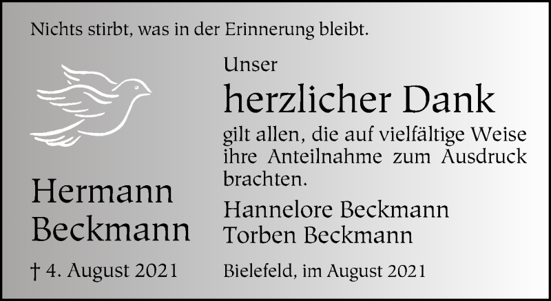 Hier finden Sie alle Traueranzeigen aus der Zeitung, die bisher für Hermann Beckmann erschienen sind. Weitere Traueranzeigen, die in der Zeitung erscheinen, werden hier ebenfalls aufgelistet