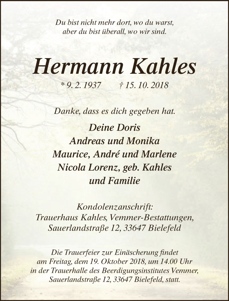 Hier finden Sie alle Traueranzeigen aus der Zeitung, die bisher für Hermann Kahles erschienen sind. Weitere Traueranzeigen, die in der Zeitung erscheinen, werden hier ebenfalls aufgelistet