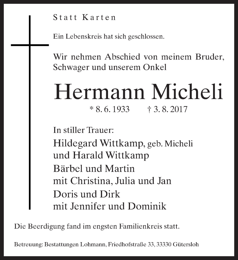 Hier finden Sie alle Traueranzeigen aus der Zeitung, die bisher für Hermann Micheli erschienen sind. Weitere Traueranzeigen, die in der Zeitung erscheinen, werden hier ebenfalls aufgelistet