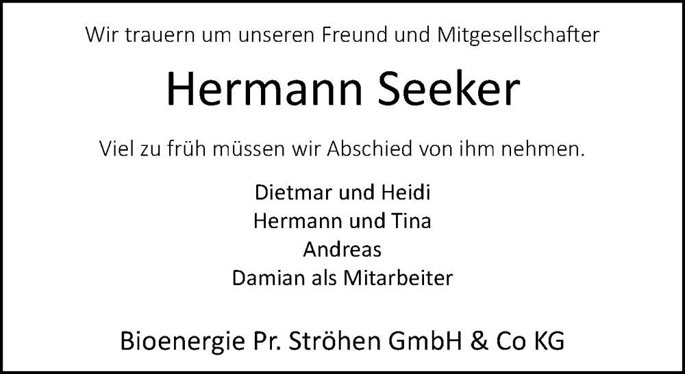 Hier finden Sie alle Traueranzeigen aus der Zeitung, die bisher für Hermann Seeker erschienen sind. Weitere Traueranzeigen, die in der Zeitung erscheinen, werden hier ebenfalls aufgelistet