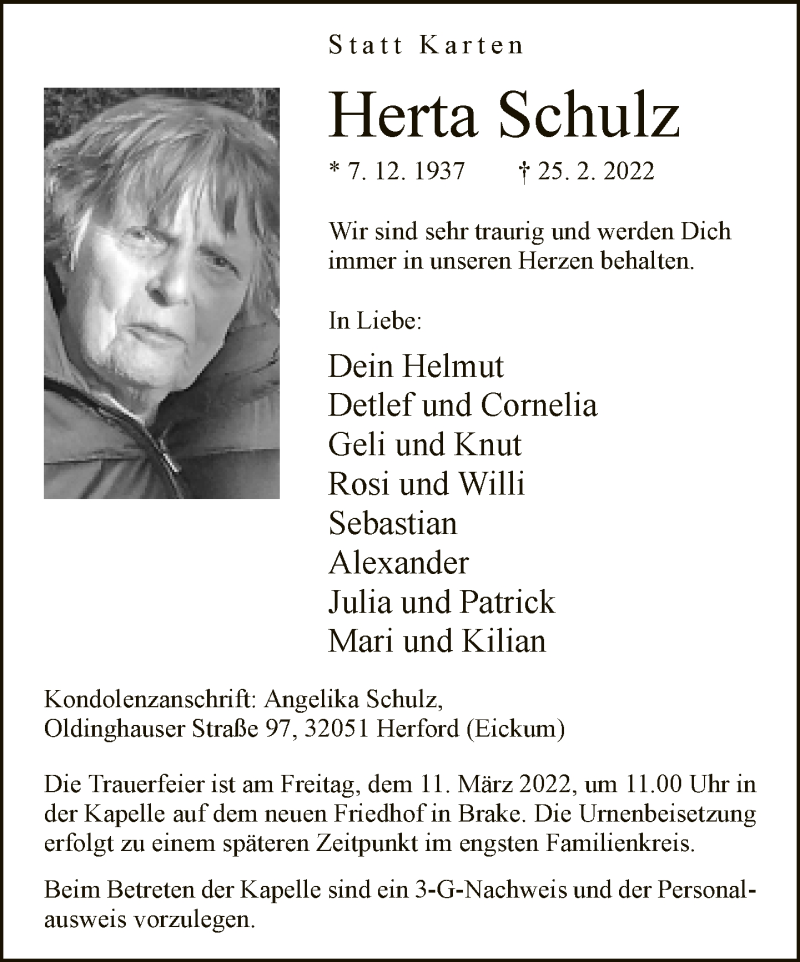 Hier finden Sie alle Traueranzeigen aus der Zeitung, die bisher für Herta Schulz erschienen sind. Weitere Traueranzeigen, die in der Zeitung erscheinen, werden hier ebenfalls aufgelistet