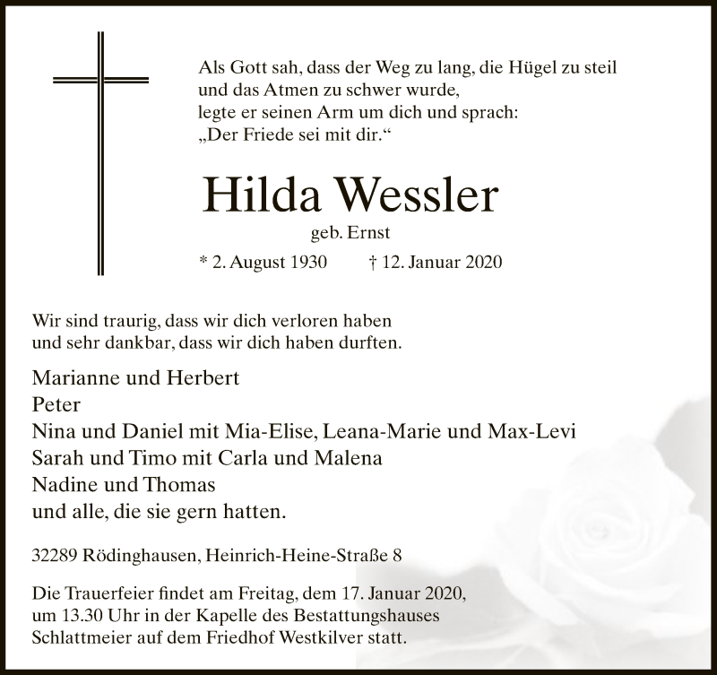 Hier finden Sie alle Traueranzeigen aus der Zeitung, die bisher für Hilda Wessler erschienen sind. Weitere Traueranzeigen, die in der Zeitung erscheinen, werden hier ebenfalls aufgelistet