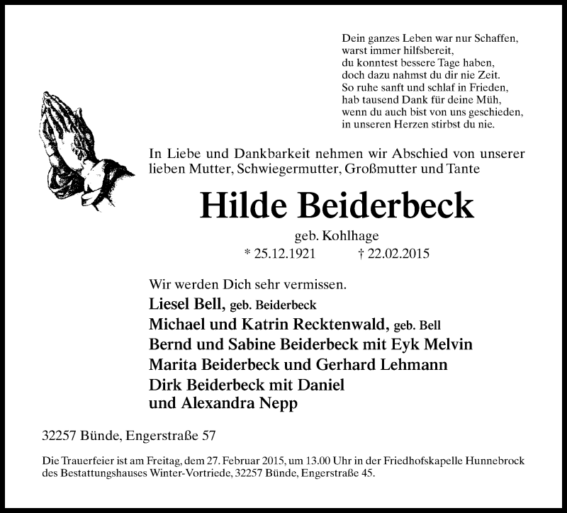 Hier finden Sie alle Traueranzeigen aus der Zeitung, die bisher für Hilde Beiderbeck erschienen sind. Weitere Traueranzeigen, die in der Zeitung erscheinen, werden hier ebenfalls aufgelistet