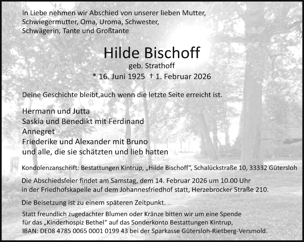 Hier finden Sie alle Traueranzeigen aus der Zeitung, die bisher für Hilde Bischoff erschienen sind. Weitere Traueranzeigen, die in der Zeitung erscheinen, werden hier ebenfalls aufgelistet