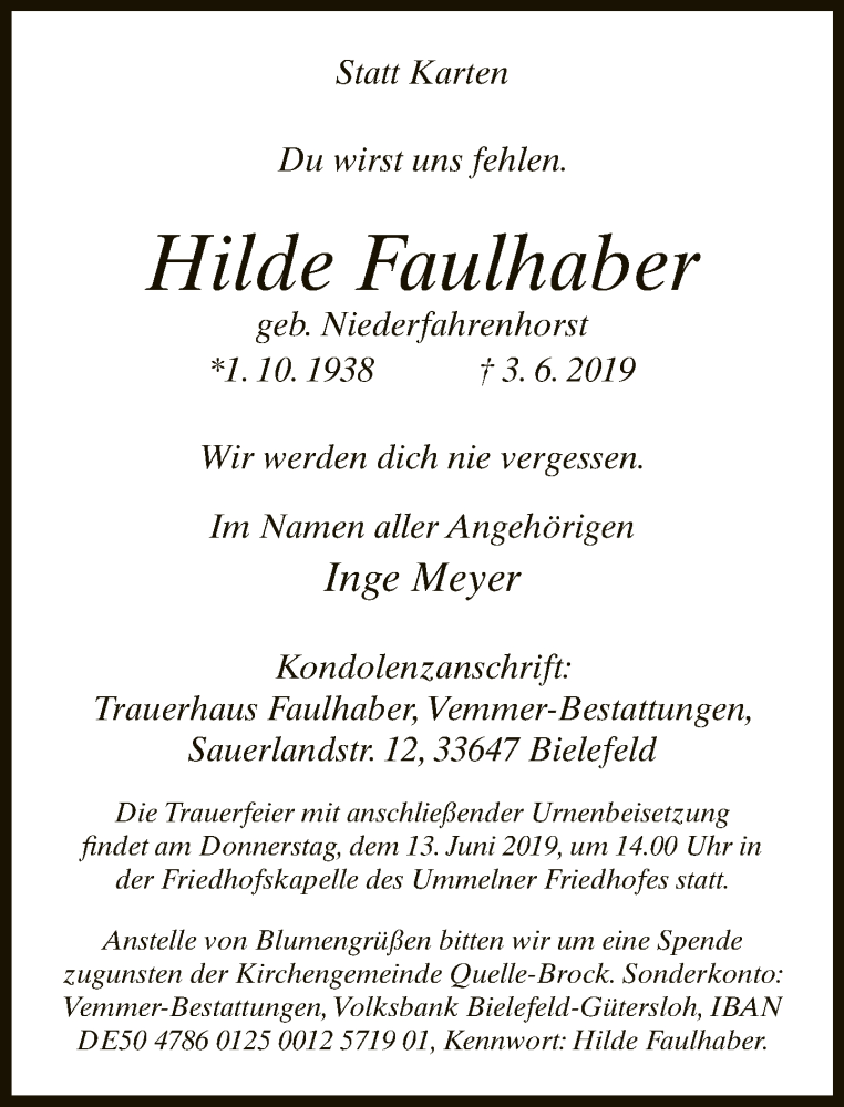 Hier finden Sie alle Traueranzeigen aus der Zeitung, die bisher für Hilde Faulhaber erschienen sind. Weitere Traueranzeigen, die in der Zeitung erscheinen, werden hier ebenfalls aufgelistet