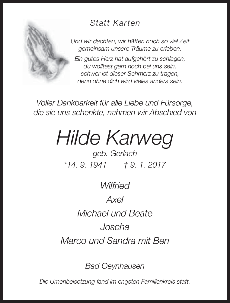 Hier finden Sie alle Traueranzeigen aus der Zeitung, die bisher für Hilde Karweg erschienen sind. Weitere Traueranzeigen, die in der Zeitung erscheinen, werden hier ebenfalls aufgelistet