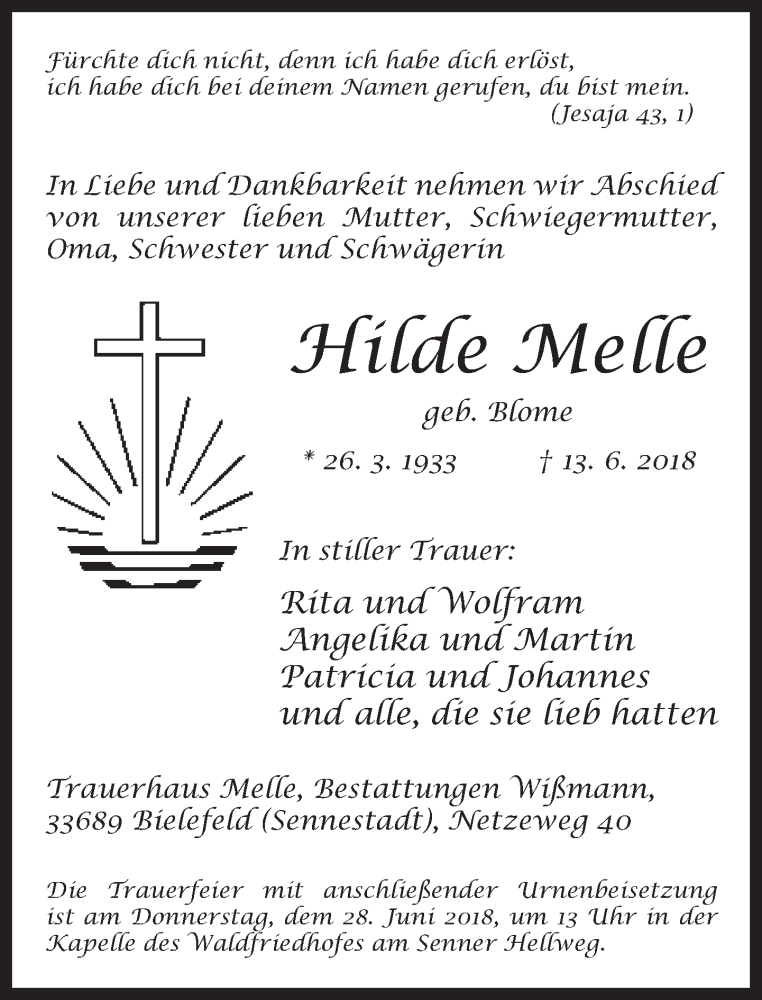 Hier finden Sie alle Traueranzeigen aus der Zeitung, die bisher für Hilde Melle erschienen sind. Weitere Traueranzeigen, die in der Zeitung erscheinen, werden hier ebenfalls aufgelistet