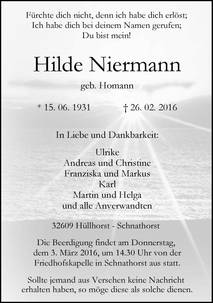 Hier finden Sie alle Traueranzeigen aus der Zeitung, die bisher für Hilde Niermann erschienen sind. Weitere Traueranzeigen, die in der Zeitung erscheinen, werden hier ebenfalls aufgelistet