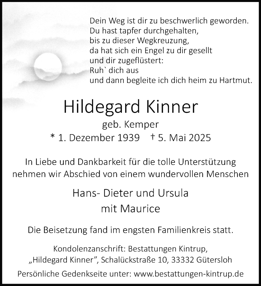 Hier finden Sie alle Traueranzeigen aus der Zeitung, die bisher für Hildegard Kinner erschienen sind. Weitere Traueranzeigen, die in der Zeitung erscheinen, werden hier ebenfalls aufgelistet