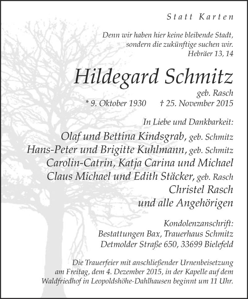 Hier finden Sie alle Traueranzeigen aus der Zeitung, die bisher für Hildegard Schmitz erschienen sind. Weitere Traueranzeigen, die in der Zeitung erscheinen, werden hier ebenfalls aufgelistet