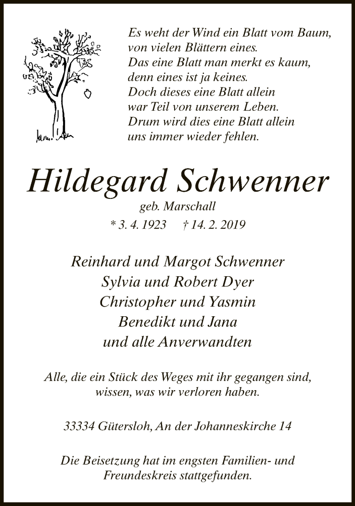 Hier finden Sie alle Traueranzeigen aus der Zeitung, die bisher für Hildegard Schwenner erschienen sind. Weitere Traueranzeigen, die in der Zeitung erscheinen, werden hier ebenfalls aufgelistet
