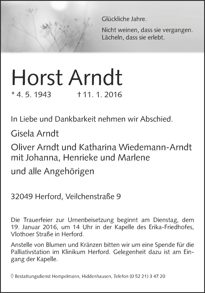 Hier finden Sie alle Traueranzeigen aus der Zeitung, die bisher für Horst Arndt erschienen sind. Weitere Traueranzeigen, die in der Zeitung erscheinen, werden hier ebenfalls aufgelistet