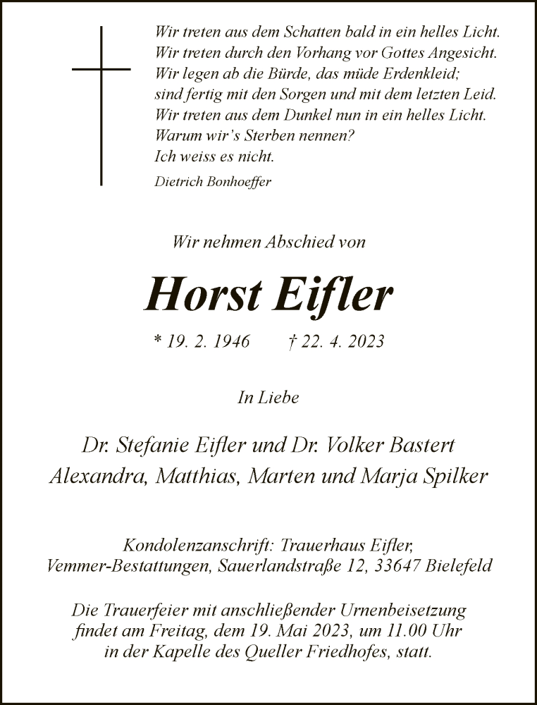 Hier finden Sie alle Traueranzeigen aus der Zeitung, die bisher für Horst Eifler erschienen sind. Weitere Traueranzeigen, die in der Zeitung erscheinen, werden hier ebenfalls aufgelistet
