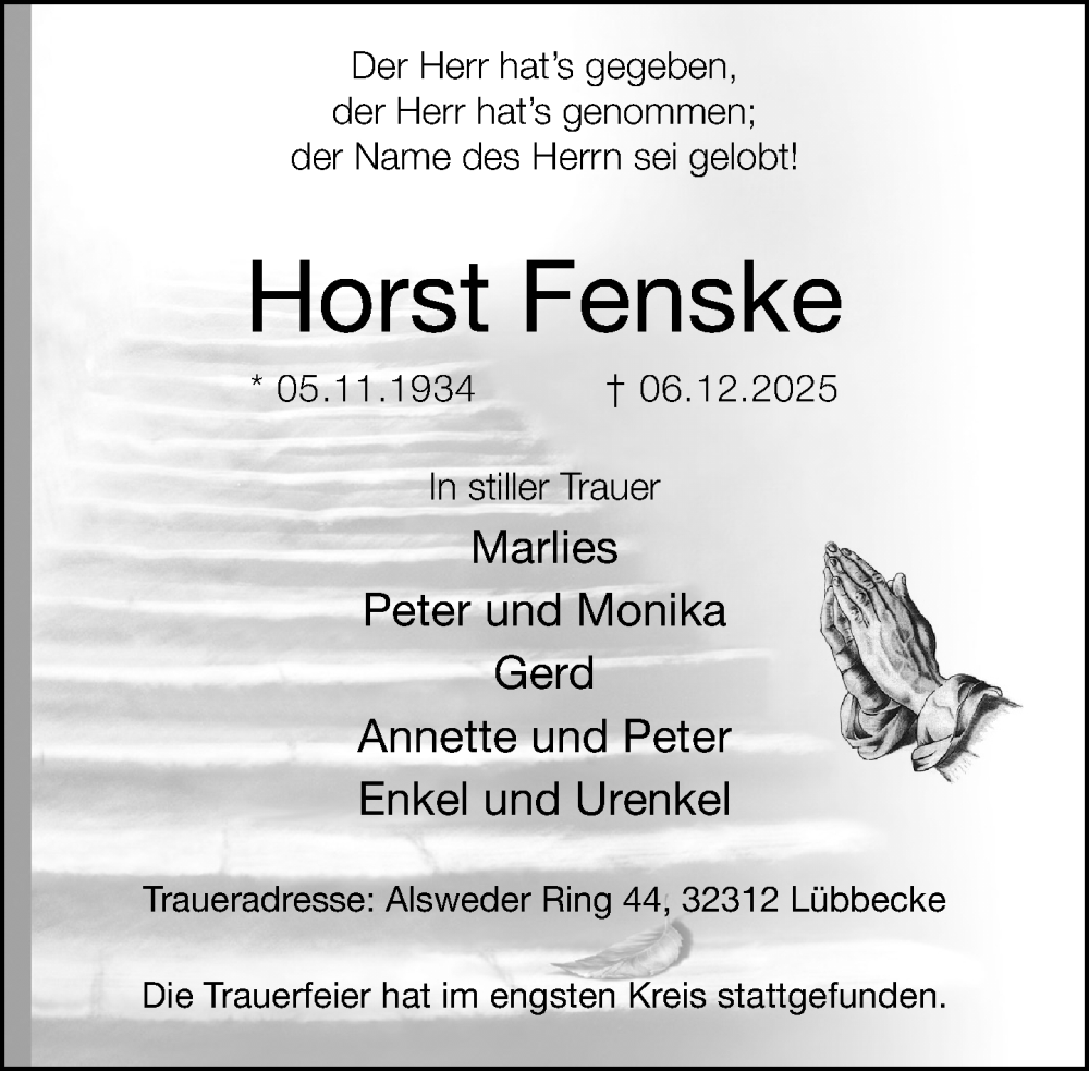 Hier finden Sie alle Traueranzeigen aus der Zeitung, die bisher für Horst Fenske erschienen sind. Weitere Traueranzeigen, die in der Zeitung erscheinen, werden hier ebenfalls aufgelistet
