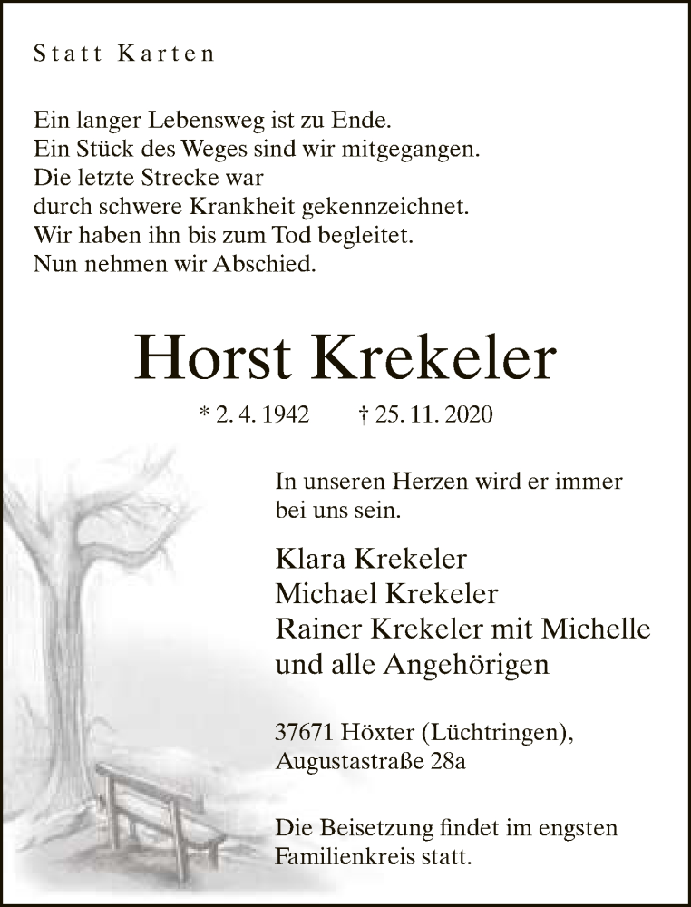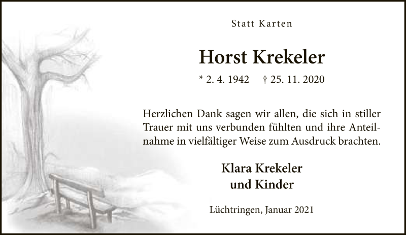 Hier finden Sie alle Traueranzeigen aus der Zeitung, die bisher für Horst Krekeler erschienen sind. Weitere Traueranzeigen, die in der Zeitung erscheinen, werden hier ebenfalls aufgelistet