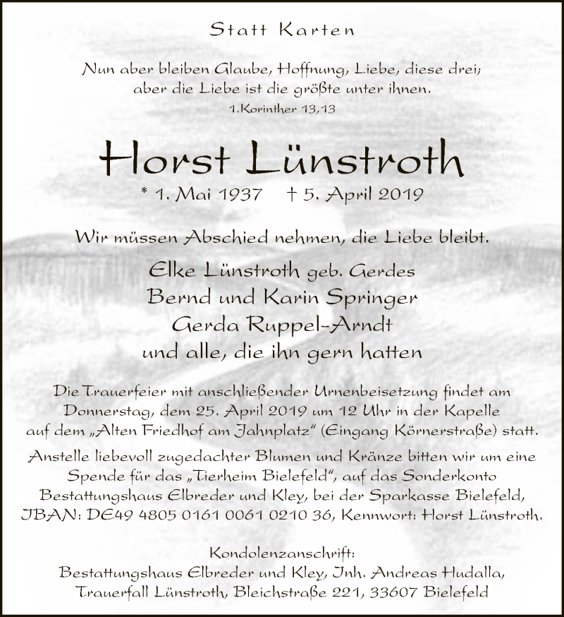 Hier finden Sie alle Traueranzeigen aus der Zeitung, die bisher für Horst Lünstroth erschienen sind. Weitere Traueranzeigen, die in der Zeitung erscheinen, werden hier ebenfalls aufgelistet