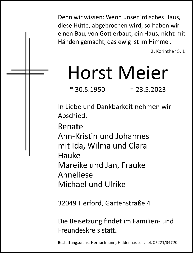 Hier finden Sie alle Traueranzeigen aus der Zeitung, die bisher für Horst Meier erschienen sind. Weitere Traueranzeigen, die in der Zeitung erscheinen, werden hier ebenfalls aufgelistet