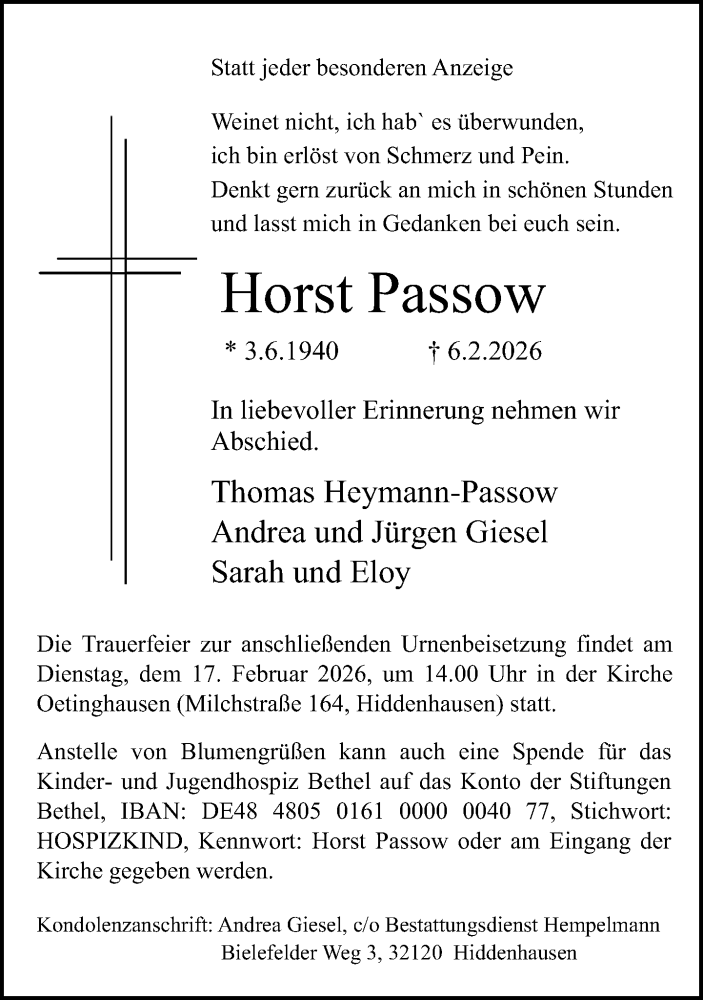Hier finden Sie alle Traueranzeigen aus der Zeitung, die bisher für Horst Passow erschienen sind. Weitere Traueranzeigen, die in der Zeitung erscheinen, werden hier ebenfalls aufgelistet