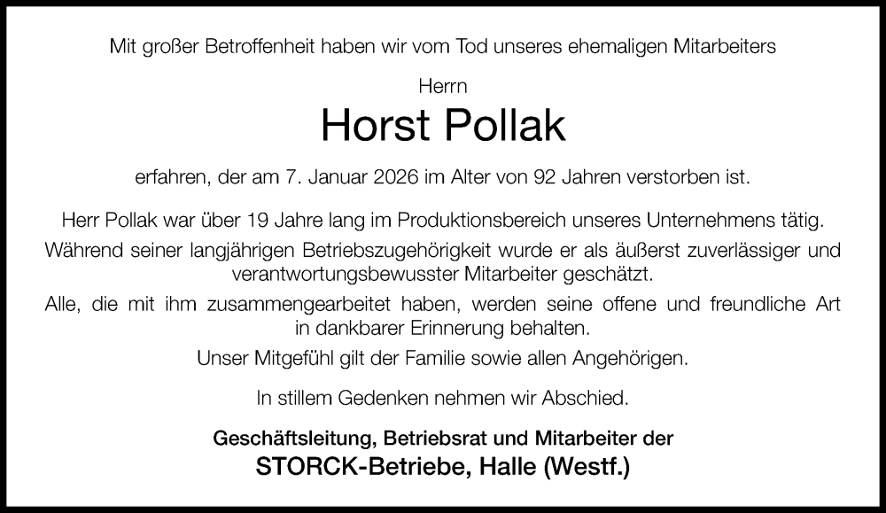 Hier finden Sie alle Traueranzeigen aus der Zeitung, die bisher für Horst Pollak erschienen sind. Weitere Traueranzeigen, die in der Zeitung erscheinen, werden hier ebenfalls aufgelistet