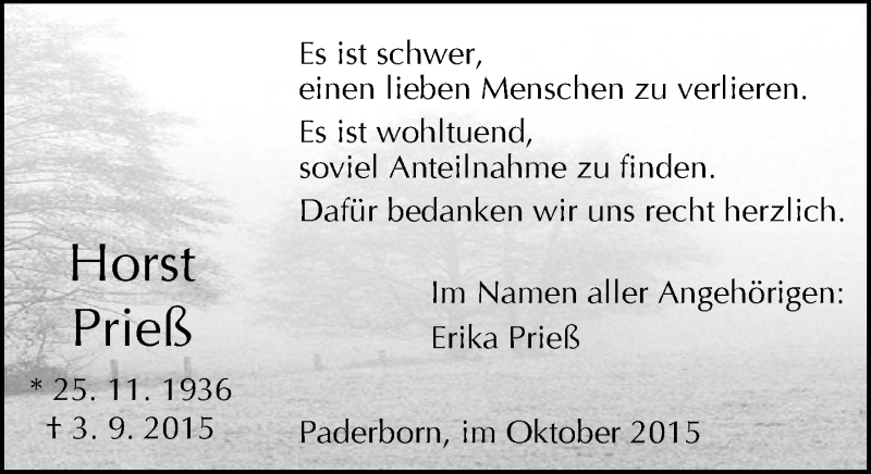 Hier finden Sie alle Traueranzeigen aus der Zeitung, die bisher für Horst Prieß erschienen sind. Weitere Traueranzeigen, die in der Zeitung erscheinen, werden hier ebenfalls aufgelistet