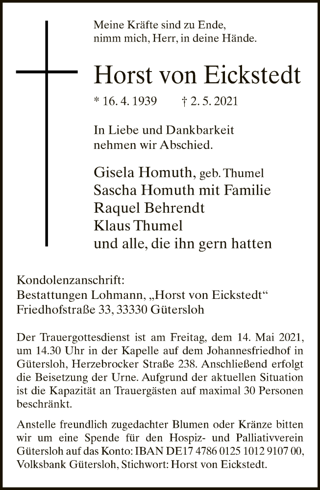 Hier finden Sie alle Traueranzeigen aus der Zeitung, die bisher für Horst von Eickstedt erschienen sind. Weitere Traueranzeigen, die in der Zeitung erscheinen, werden hier ebenfalls aufgelistet
