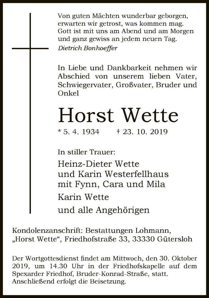 Hier finden Sie alle Traueranzeigen aus der Zeitung, die bisher für Horst Wette erschienen sind. Weitere Traueranzeigen, die in der Zeitung erscheinen, werden hier ebenfalls aufgelistet