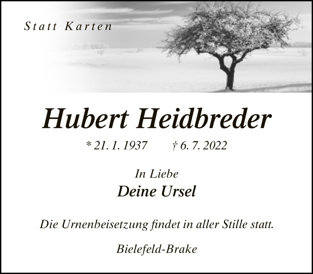 Hier finden Sie alle Traueranzeigen aus der Zeitung, die bisher für Hubert Heidbreder erschienen sind. Weitere Traueranzeigen, die in der Zeitung erscheinen, werden hier ebenfalls aufgelistet