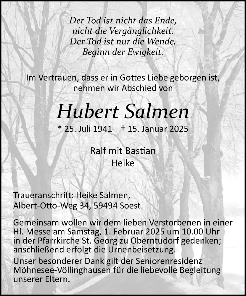 Hier finden Sie alle Traueranzeigen aus der Zeitung, die bisher für Hubert Salmen erschienen sind. Weitere Traueranzeigen, die in der Zeitung erscheinen, werden hier ebenfalls aufgelistet