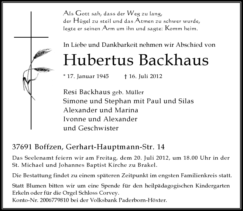 Hier finden Sie alle Traueranzeigen aus der Zeitung, die bisher für Hubertus Backhaus erschienen sind. Weitere Traueranzeigen, die in der Zeitung erscheinen, werden hier ebenfalls aufgelistet
