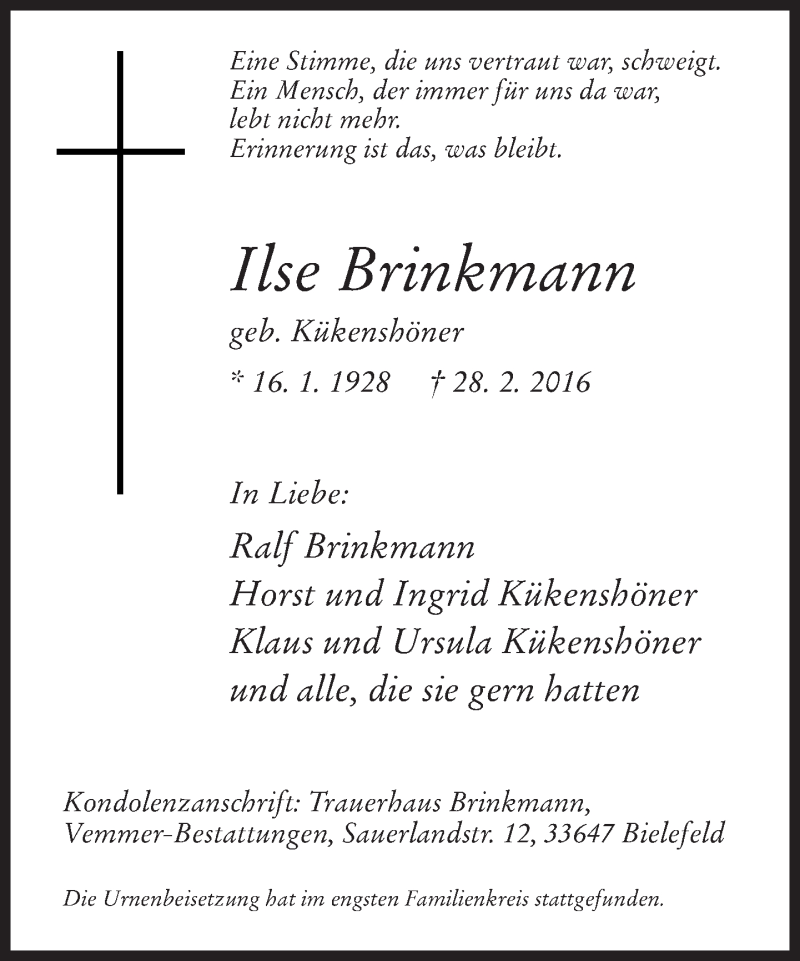 Hier finden Sie alle Traueranzeigen aus der Zeitung, die bisher für Ilse Brinkmann erschienen sind. Weitere Traueranzeigen, die in der Zeitung erscheinen, werden hier ebenfalls aufgelistet