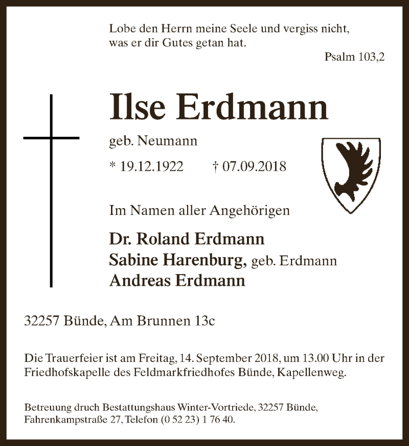 Hier finden Sie alle Traueranzeigen aus der Zeitung, die bisher für Ilse Erdmann erschienen sind. Weitere Traueranzeigen, die in der Zeitung erscheinen, werden hier ebenfalls aufgelistet
