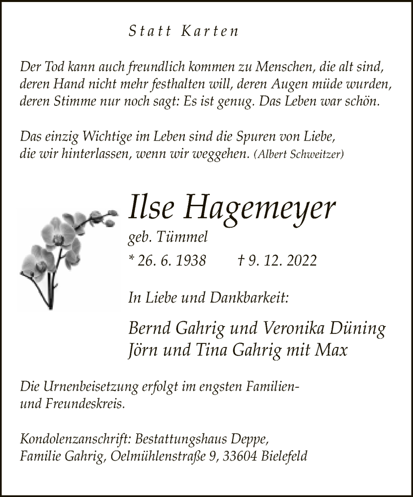 Hier finden Sie alle Traueranzeigen aus der Zeitung, die bisher für Ilse Hagemeyer erschienen sind. Weitere Traueranzeigen, die in der Zeitung erscheinen, werden hier ebenfalls aufgelistet