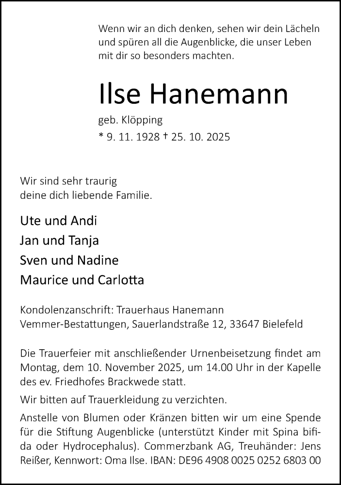 Hier finden Sie alle Traueranzeigen aus der Zeitung, die bisher für Ilse Hanemann erschienen sind. Weitere Traueranzeigen, die in der Zeitung erscheinen, werden hier ebenfalls aufgelistet