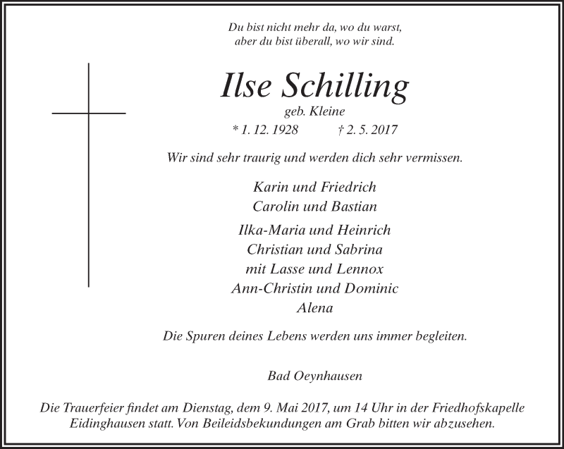 Hier finden Sie alle Traueranzeigen aus der Zeitung, die bisher für Ilse Schilling erschienen sind. Weitere Traueranzeigen, die in der Zeitung erscheinen, werden hier ebenfalls aufgelistet