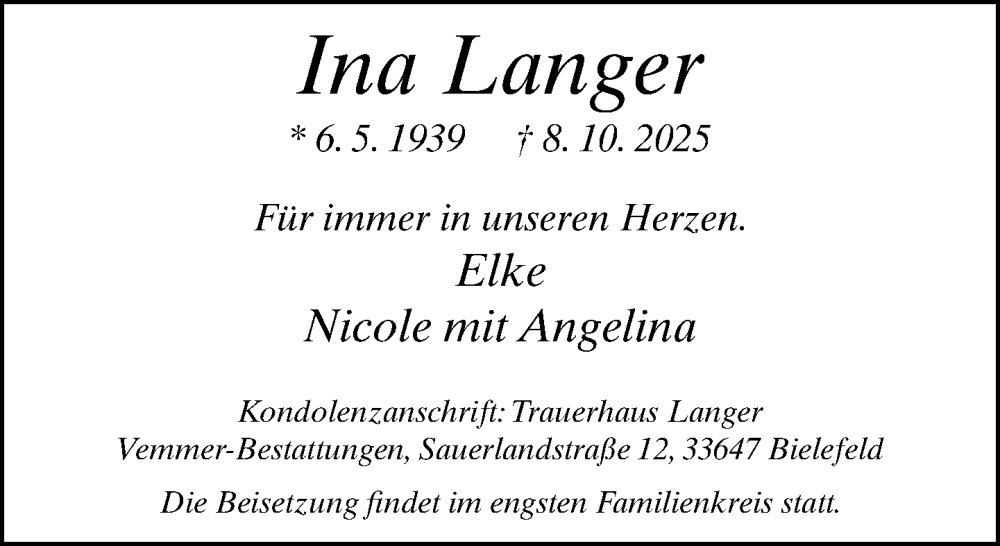 Hier finden Sie alle Traueranzeigen aus der Zeitung, die bisher für Ina Langer erschienen sind. Weitere Traueranzeigen, die in der Zeitung erscheinen, werden hier ebenfalls aufgelistet