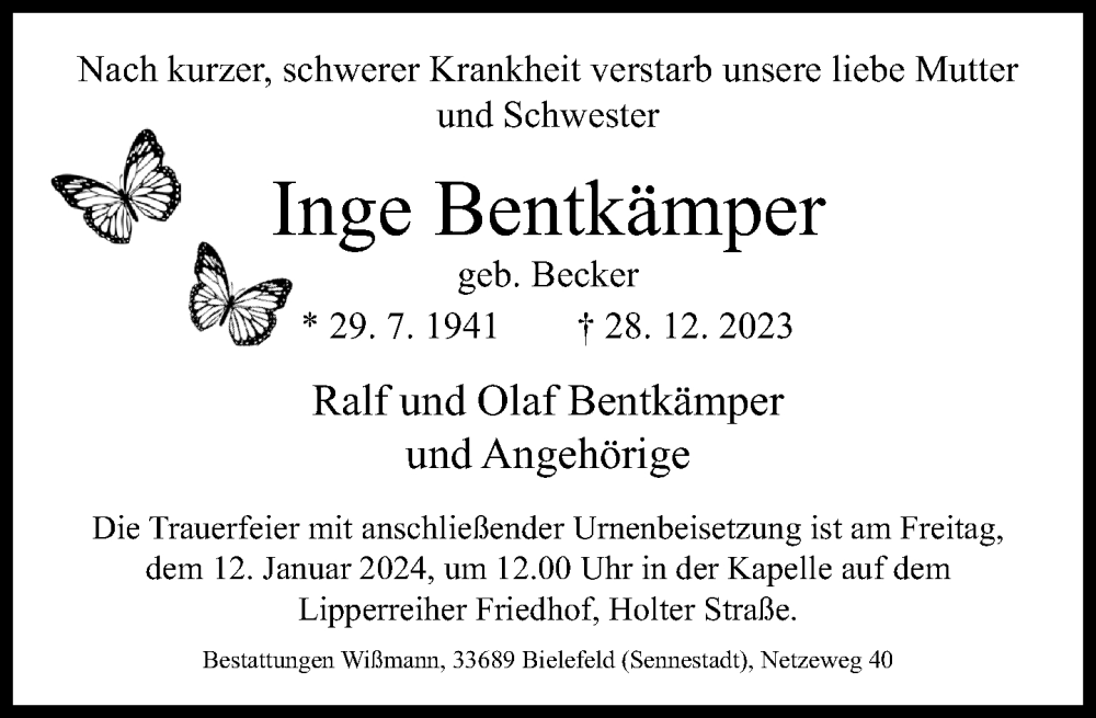 Hier finden Sie alle Traueranzeigen aus der Zeitung, die bisher für Inge Bentkämper erschienen sind. Weitere Traueranzeigen, die in der Zeitung erscheinen, werden hier ebenfalls aufgelistet