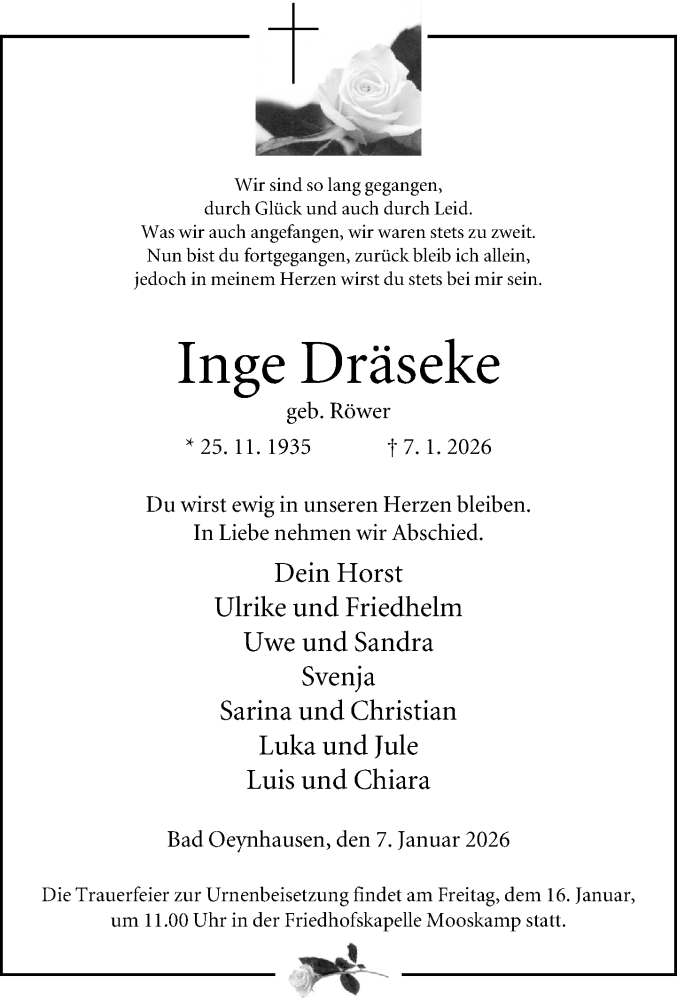 Hier finden Sie alle Traueranzeigen aus der Zeitung, die bisher für Inge Dräseke erschienen sind. Weitere Traueranzeigen, die in der Zeitung erscheinen, werden hier ebenfalls aufgelistet