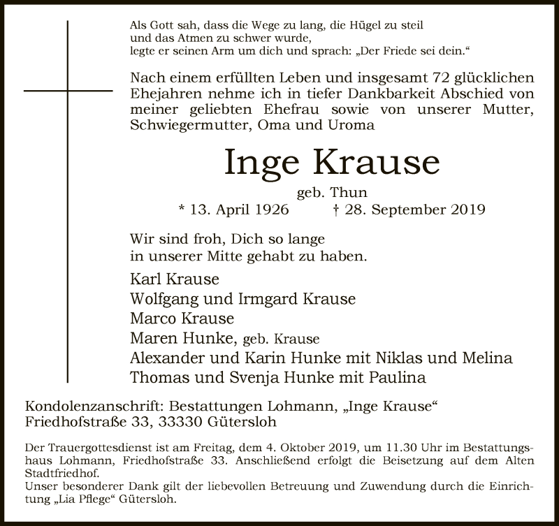 Hier finden Sie alle Traueranzeigen aus der Zeitung, die bisher für Inge Krause erschienen sind. Weitere Traueranzeigen, die in der Zeitung erscheinen, werden hier ebenfalls aufgelistet