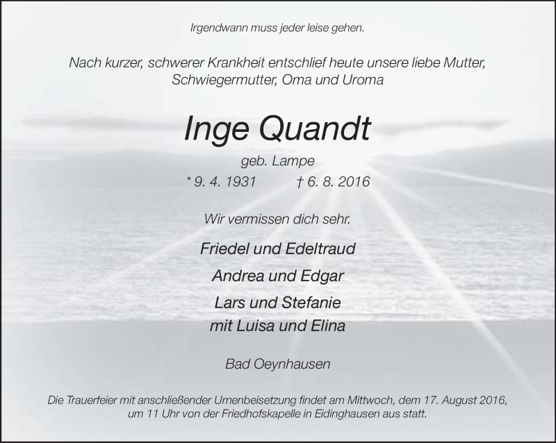 Hier finden Sie alle Traueranzeigen aus der Zeitung, die bisher für Inge Quandt erschienen sind. Weitere Traueranzeigen, die in der Zeitung erscheinen, werden hier ebenfalls aufgelistet
