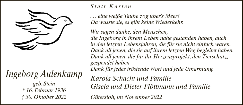 Hier finden Sie alle Traueranzeigen aus der Zeitung, die bisher für Ingeborg Aulenkamp erschienen sind. Weitere Traueranzeigen, die in der Zeitung erscheinen, werden hier ebenfalls aufgelistet