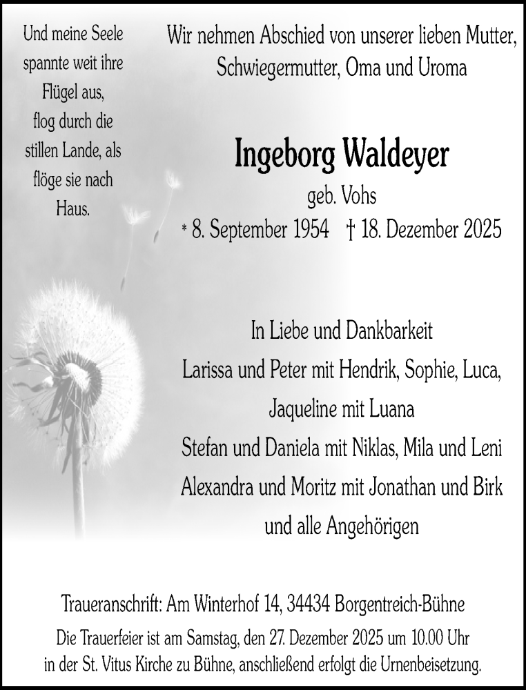 Hier finden Sie alle Traueranzeigen aus der Zeitung, die bisher für Ingeborg Waldeyer erschienen sind. Weitere Traueranzeigen, die in der Zeitung erscheinen, werden hier ebenfalls aufgelistet