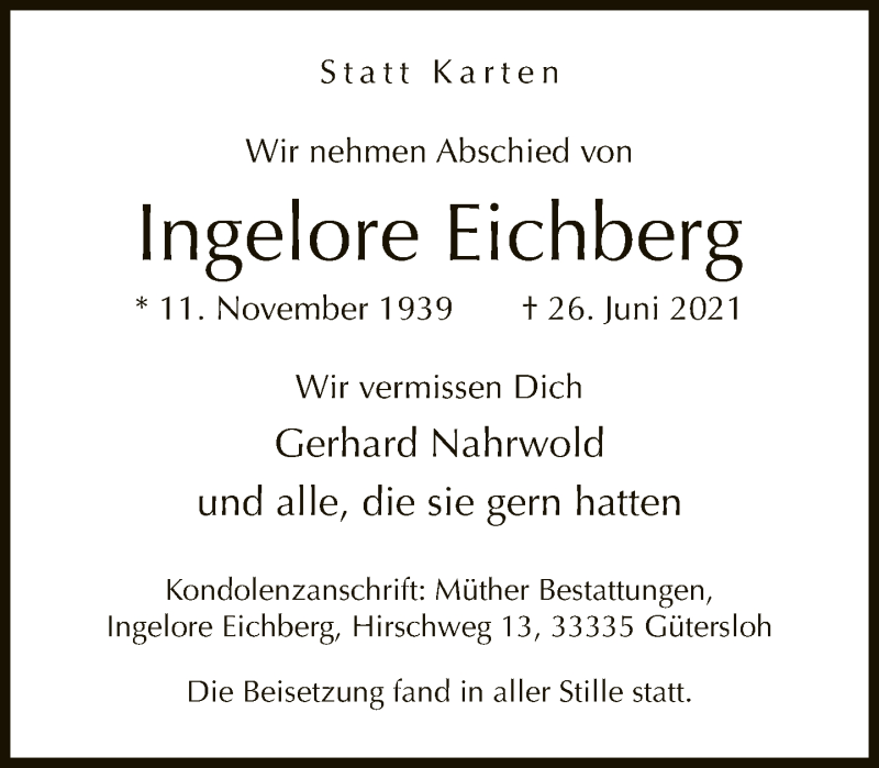 Hier finden Sie alle Traueranzeigen aus der Zeitung, die bisher für Ingelore Eichberg erschienen sind. Weitere Traueranzeigen, die in der Zeitung erscheinen, werden hier ebenfalls aufgelistet