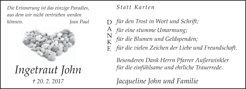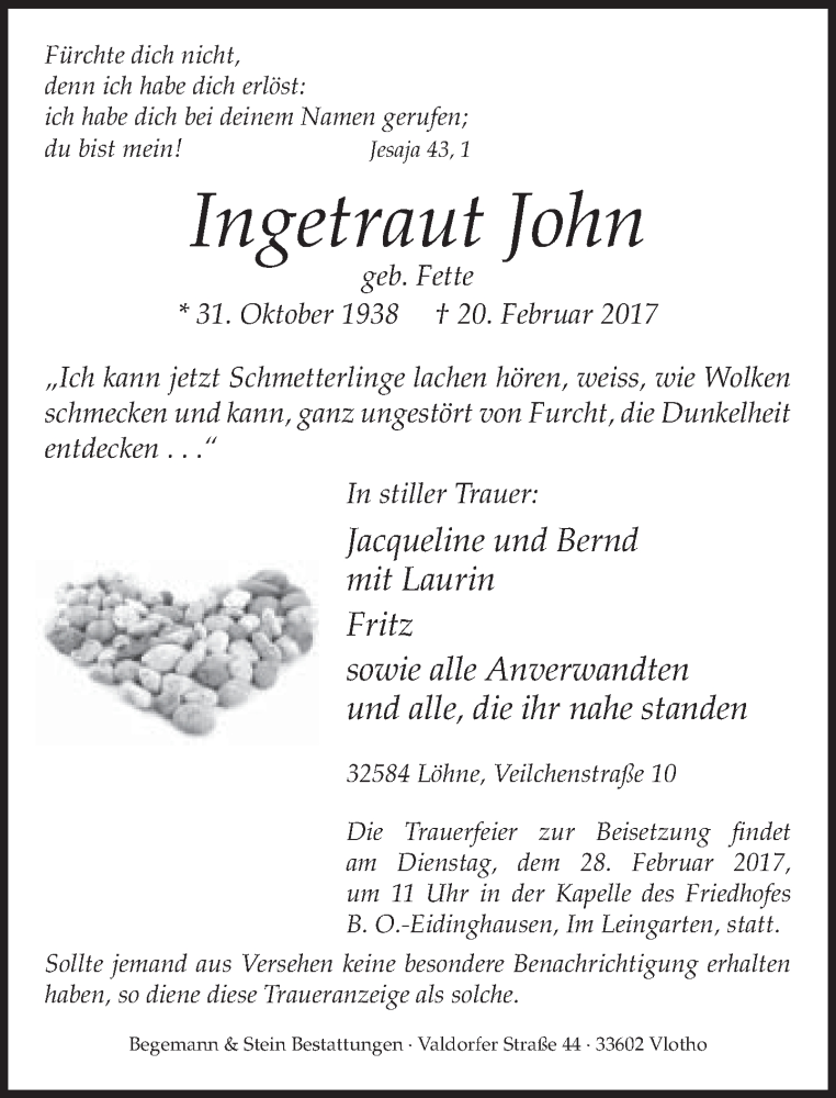Hier finden Sie alle Traueranzeigen aus der Zeitung, die bisher für Ingetraut John erschienen sind. Weitere Traueranzeigen, die in der Zeitung erscheinen, werden hier ebenfalls aufgelistet