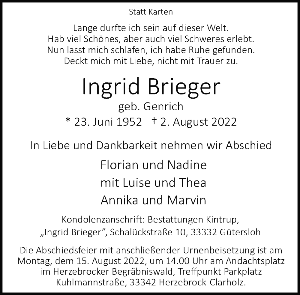 Hier finden Sie alle Traueranzeigen aus der Zeitung, die bisher für Ingrid Brieger erschienen sind. Weitere Traueranzeigen, die in der Zeitung erscheinen, werden hier ebenfalls aufgelistet