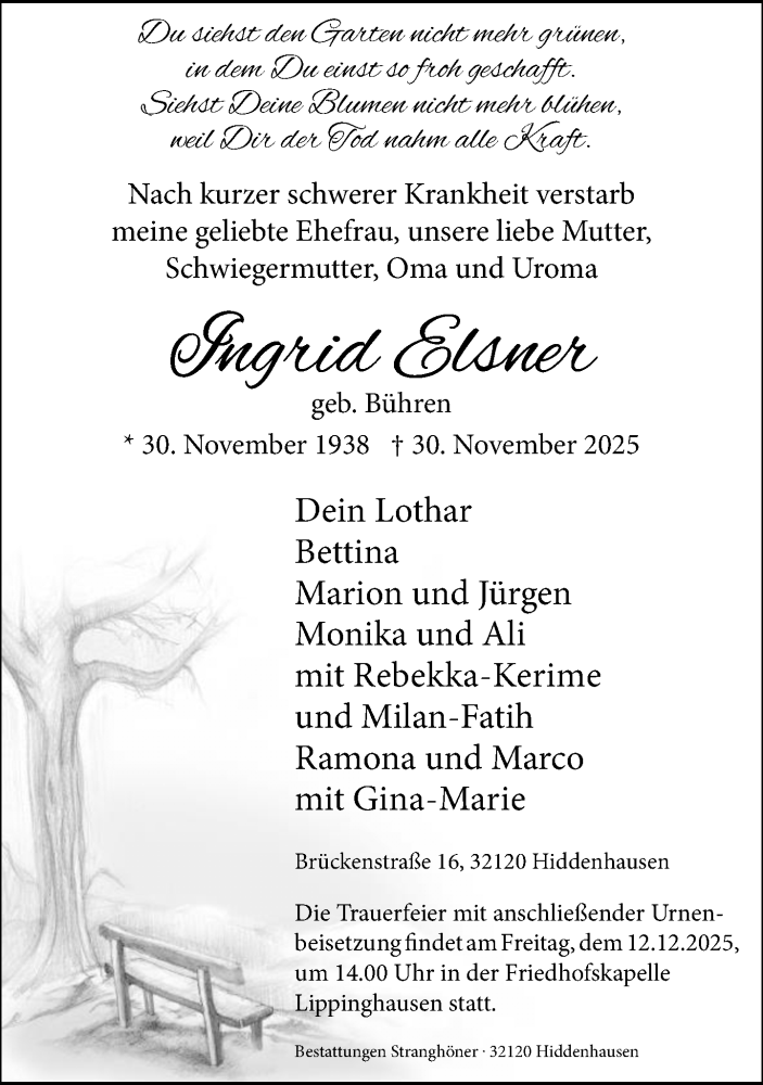Hier finden Sie alle Traueranzeigen aus der Zeitung, die bisher für Ingrid Elsner erschienen sind. Weitere Traueranzeigen, die in der Zeitung erscheinen, werden hier ebenfalls aufgelistet