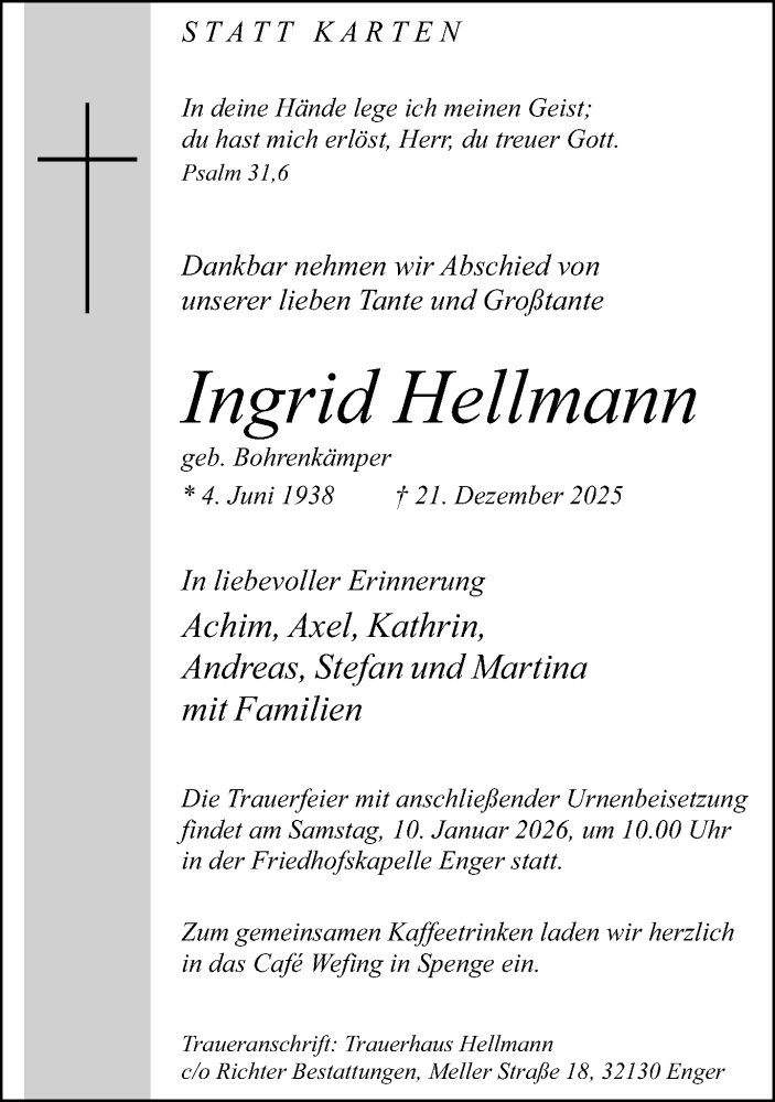 Hier finden Sie alle Traueranzeigen aus der Zeitung, die bisher für Ingrid Hellmann erschienen sind. Weitere Traueranzeigen, die in der Zeitung erscheinen, werden hier ebenfalls aufgelistet