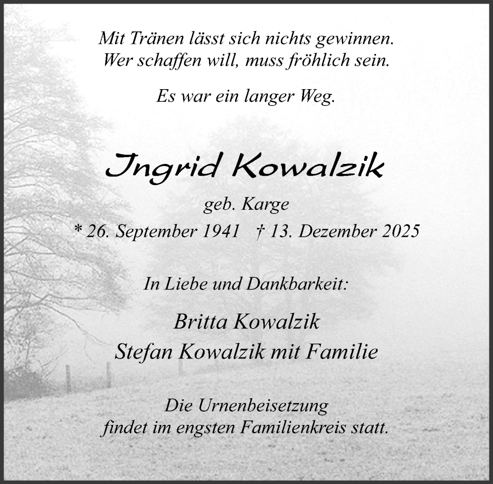 Hier finden Sie alle Traueranzeigen aus der Zeitung, die bisher für Ingrid Kowalzik erschienen sind. Weitere Traueranzeigen, die in der Zeitung erscheinen, werden hier ebenfalls aufgelistet